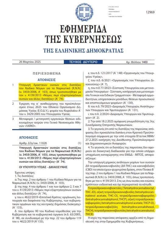 Η αρχή για να περιοριστεί το τεράστιο φαινόμενο ανεξέλεγκτης χρήσης αυτών των ουσιών (τετραυδροκανναβιοκτύλης, οξικής τερταυδροκανναβιοκτύλης, ΤHC κ.ά.) ακόμη και από ανήλικους επεσήμανε ο κ. Παναγιωτόπουλος, δίνοντας εύσημα για αυτή την ενέργεια στην Πολιτεία. Μέχρι τώρα κυκλοφορούσαν ελεύθερα από επιτήδειους ψυχοδραστικές ουσίες, που ανήκαν στην ίδια «οικογένεια» της τερταυδροκανναβιοκτυλης ως προς την χημεία με αντίστοιχες ιδιότητες. Μάλιστα ο κ.Παναγιωτόπουλος επεσήμανε ότι εν αναμονή της νομοθεσίας «ήδη έχουν άλλα δυο συγγενή μόρια έτοιμα που τα κυκλοφορούν στην αγορά ως προϊόντα» αλλά τη στιγμή που θα απαγορευθεί το THC, επίσημα θα μπει στον κατάλογο των ναρκωτικών και το ΦΕΚ περιλαμβάνει και τα ισομερή, θα είναι απαγορευμένες τρόπον τινά.