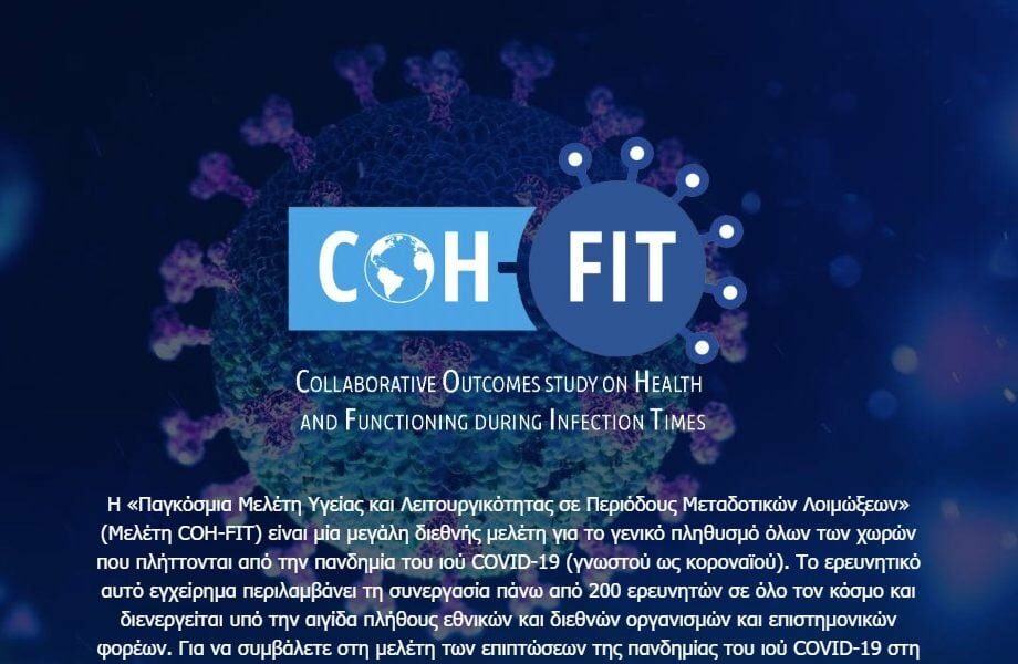 Πρόκειται για τη μελέτη COH-FIT, η οποία αποσκοπεί στη «διερεύνηση παραγόντων που επηρεάζουν τη σωματική και ψυχική υγεία σε καιρούς μεταδοτικών λοιμώξεων και περιοριστικών μέτρων και την αναγνώριση προστατευτικών παραγόντων που θα μπορούσαν να οδηγήσουν στην ανάπτυξη στρατηγικών πρόληψης και παρέμβασης κατά την πανδημία του ιού COVID-19 αλλά και μελλοντικά, σε περίπτωση εμφάνισης άλλων καταστάσεων πανδημίας».