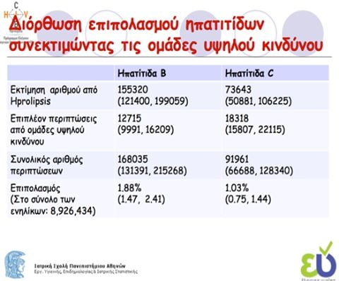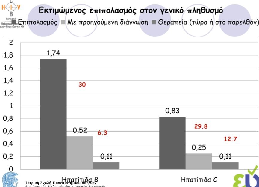 Ειδικότερα, σε πληθυσμό περίπου 9 εκατομμυρίων ενηλίκων που ζουν στην Ελλάδα, ο επιπολασμός της Ηπατίτιδας Β υπολογίζεται στο 1,88% και της Ηπατίτιδας C στο 1.03%