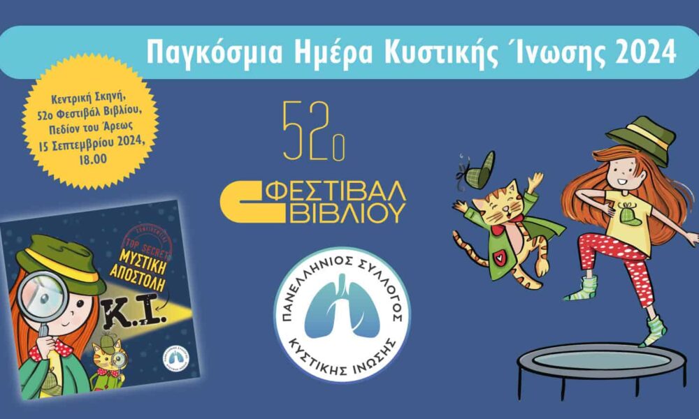 Με αφορμή την Παγκόσμια Ημέρα Κυστικής Ίνωσης ο Πανελλήνιος Σύλλογος Κυστικής Ίνωσης και η συγγραφέας- εικονογράφος, Λιάνα Δενεζάκη, παρουσιάζουν το βιβλίο «Μυστική Αποστολή: K.I.», στο 52ο Φεστιβάλ Βιβλίου.