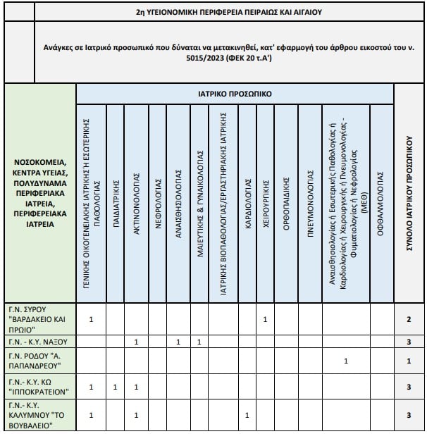 Η τροποποίηση του συγκεντρωτικού πίνακα μετακινήσεων ιατρικού προσωπικού εγκρίθηκε για την 2η Υγειονομική Περιφέρεια (Υ.Πε.) Πειραιώς και Αιγαίου, σύμφωνα με το άρθρο 63 του ν. 5129/2024 (Α 124).