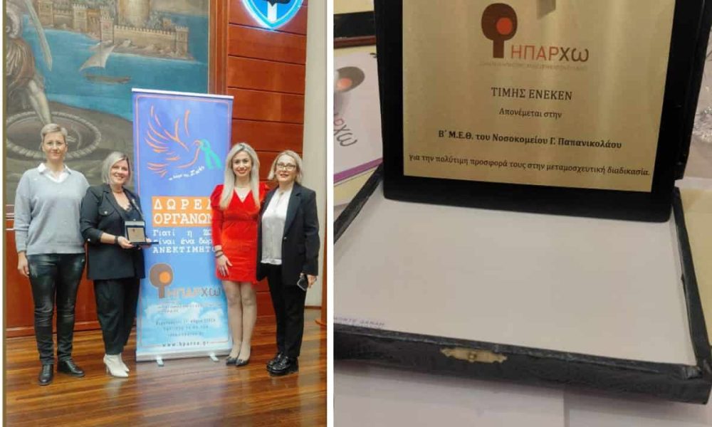 Τη σημαντική συμβολή της στη διαδικασία δωρεάς οργάνων και μεταμοσχεύσεων τίμησε το Σωματείο Ηπατομοσχευθέντων Ελλάδος «ΗΠΑΡχω», βραβεύοντας τη Β΄ Μονάδα Εντατικής Θεραπείας του Γενικού Νοσοκομείου Θεσσαλονίκης «Γεώργιος Παπανικολάου». Η απονομή πραγματοποιήθηκε στις 14 Φεβρουαρίου 2026, στο πλαίσιο της καθιερωμένης εκδήλωσης κοπής βασιλόπιτας του Σωματείου, αναδεικνύοντας τον κρίσιμο ρόλο της ΜΕΘ στη μεταμοσχευτική αλυσίδα.