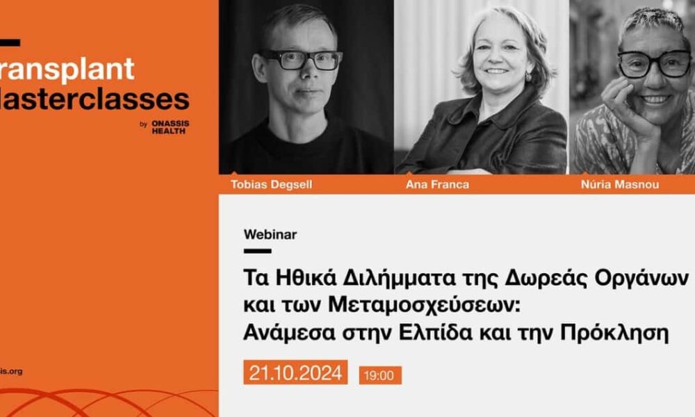 «Τα ηθικά διλήμματα της δωρεάς οργάνων και των μεταμοσχεύσεων: Ανάμεσα στην ελπίδα και την πρόκληση» θα συζητηθούν σε webinar του 5ου Transplant Masterclass από το Ίδρυμα Ωνάση. Το επιμορφωτικό πρόγραμμα επιστρέφει τη Δευτέρα 21 Οκτωβρίου 2024.