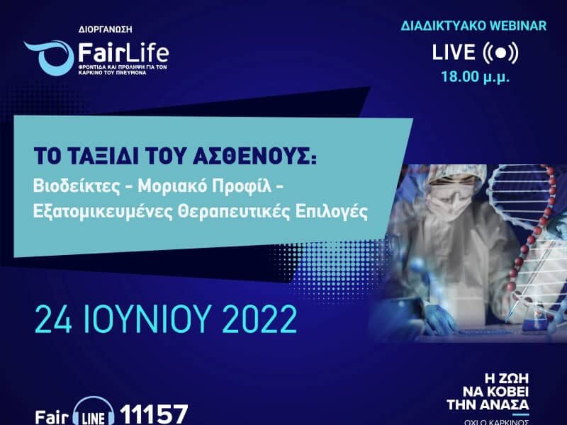Διαδικτυακή ημερίδα με θέμα «Το ταξίδι του ασθενούς: Βιοδείκτες – Μοριακό προφίλ – Εξατομικευμένες θεραπευτικές επιλογές» διοργανώνει η FairLife LCC. Η εκδήλωση είναι ανοιχτή προς το κοινό.