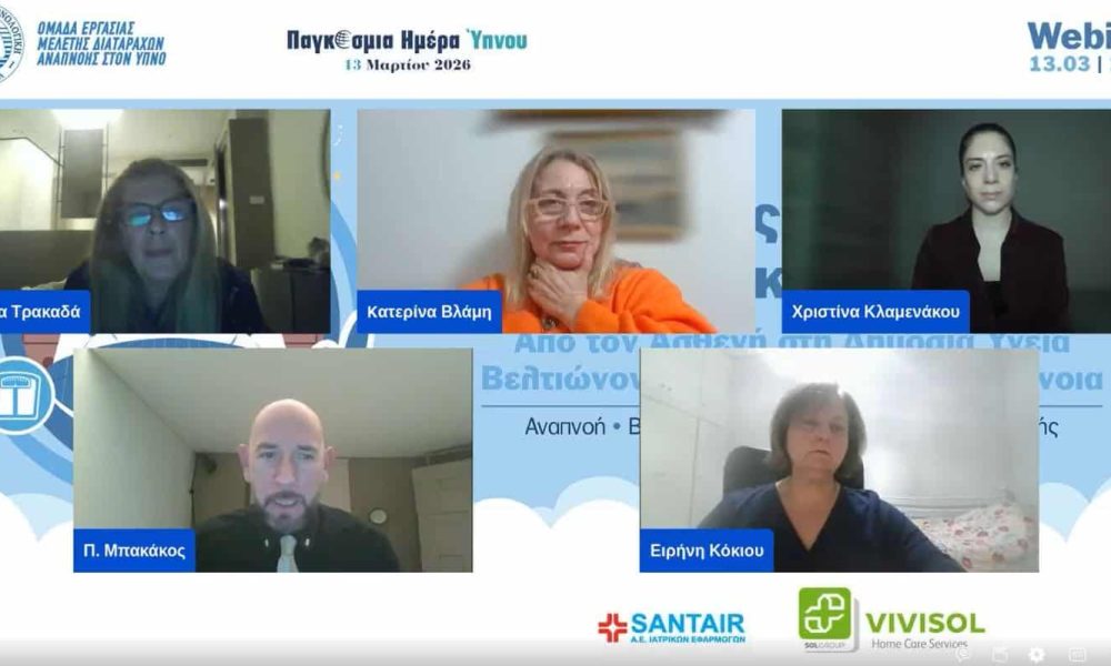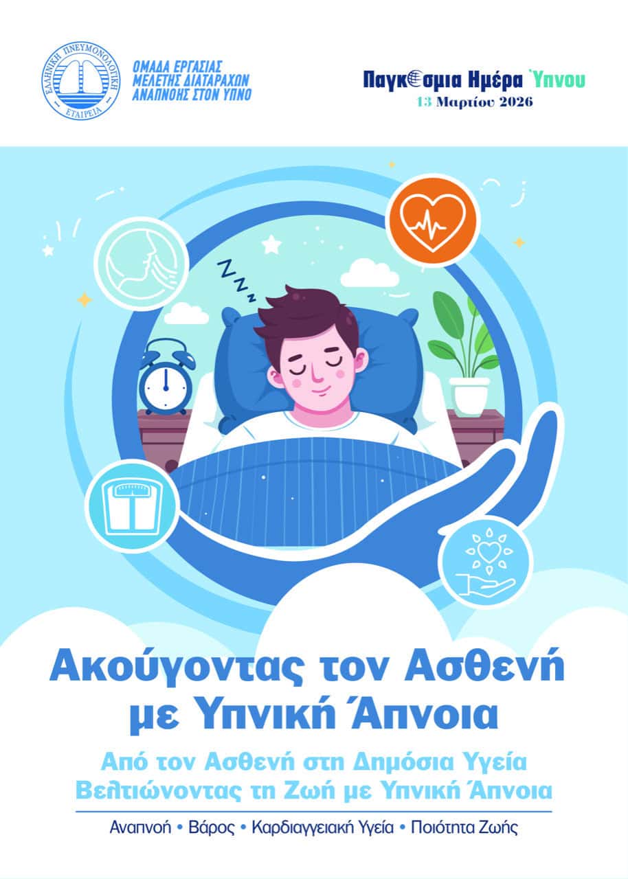 Μια ανοιχτή στο κοινό διαδικτυακή εκδήλωση για την υπνική άπνοια διοργάνωσε η Ομάδα Εργασίας Διαταραχών της Αναπνοής στον Ύπνο της Ελληνικής Πνευμονολογικής Εταιρείας. Η δράση πραγματοποιήθηκε στο πλαίσιο της Παγκόσμιας Ημέρας Ύπνου 2026, αναδεικνύοντας τον ρόλο του ασθενούς στη σύγχρονη ιατρική προσέγγιση.
